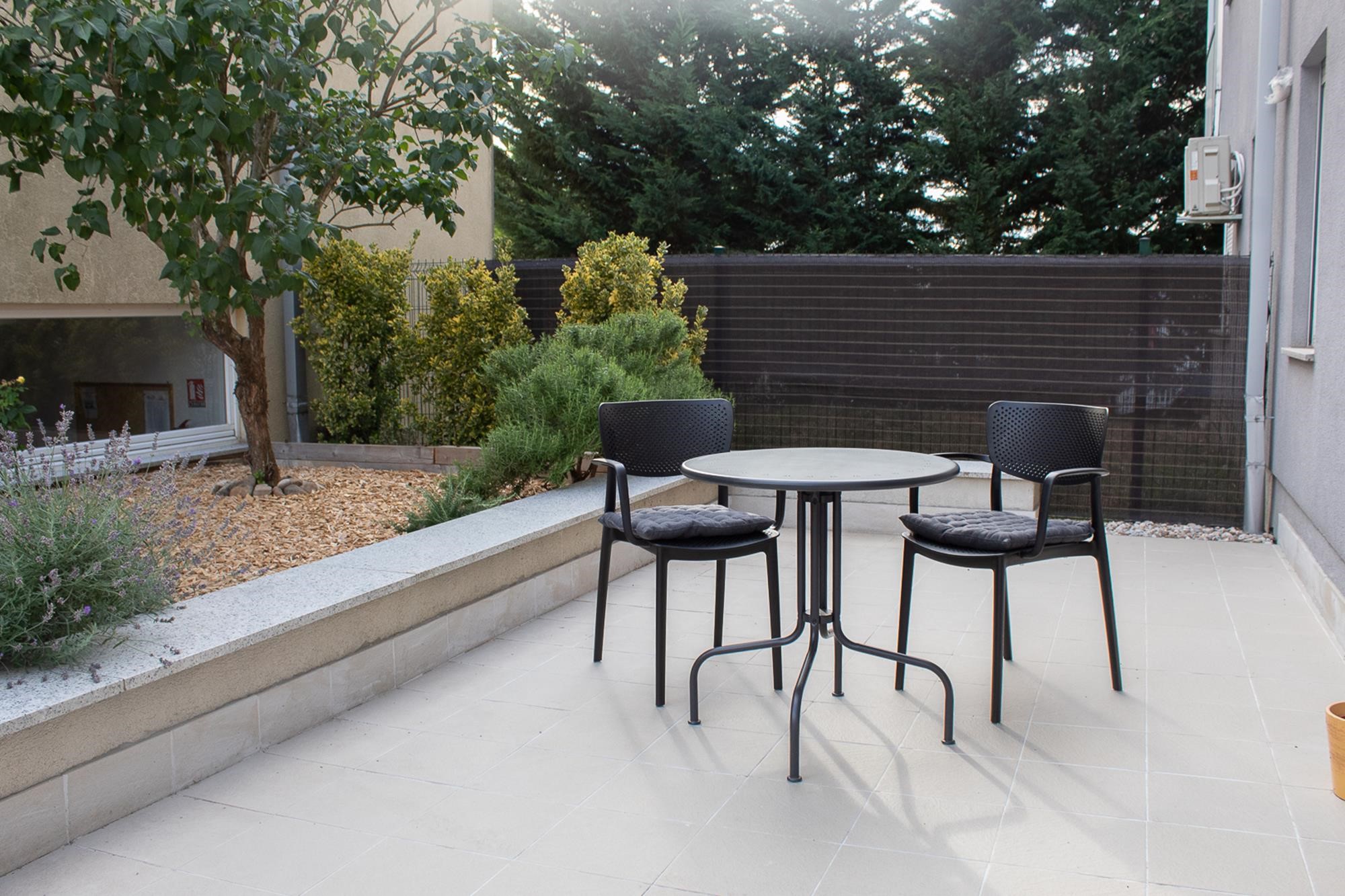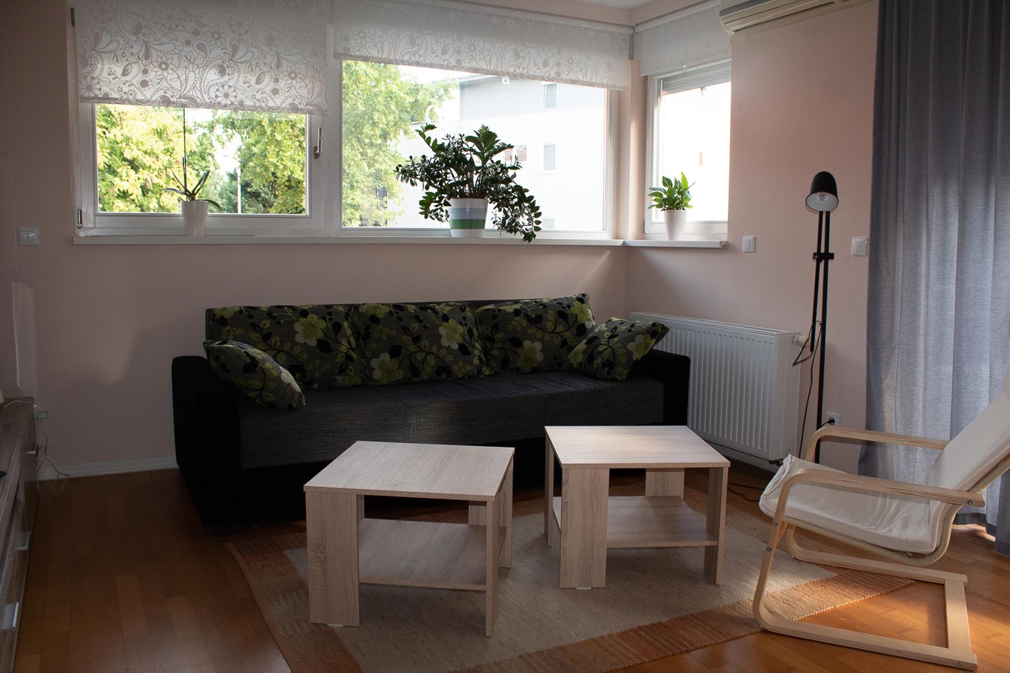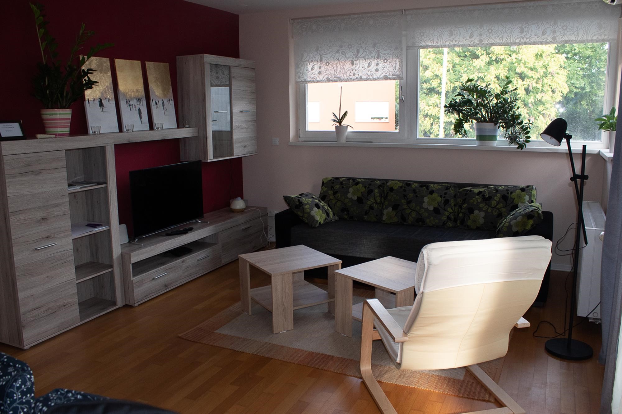 Sastoji se od spavaće sobe s bračnim krevetom, kuhinje s dnevnim boravkom, kupaonice i terese sa zelenom površinom. U sklopu apartmana je jedno garažno i jedno parkirno mjesto. Apartman je opremljen svim potrebnim uređajima i besplatnim Wi-Fi-jem.
