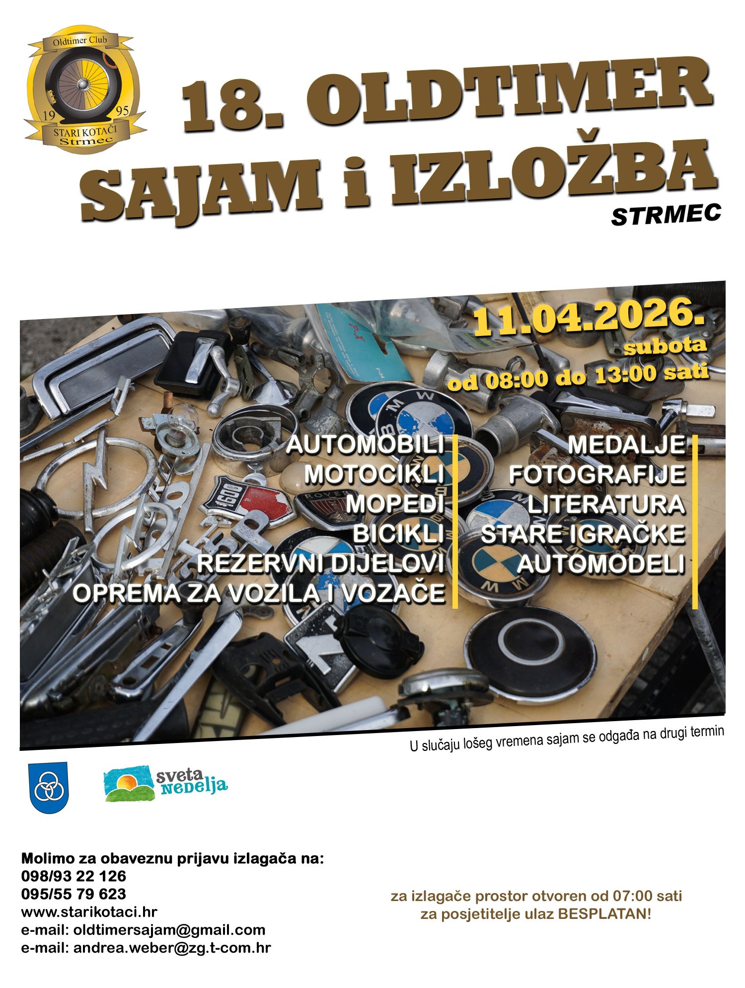 Posjetitelji će imati priliku razgledati i pronaći raznovrsnu ponudu – od automobila, motocikala, mopeda i bicikala, preko rezervnih dijelova i opreme, pa sve do medalja, fotografija, literature, starih igračaka i automodela.