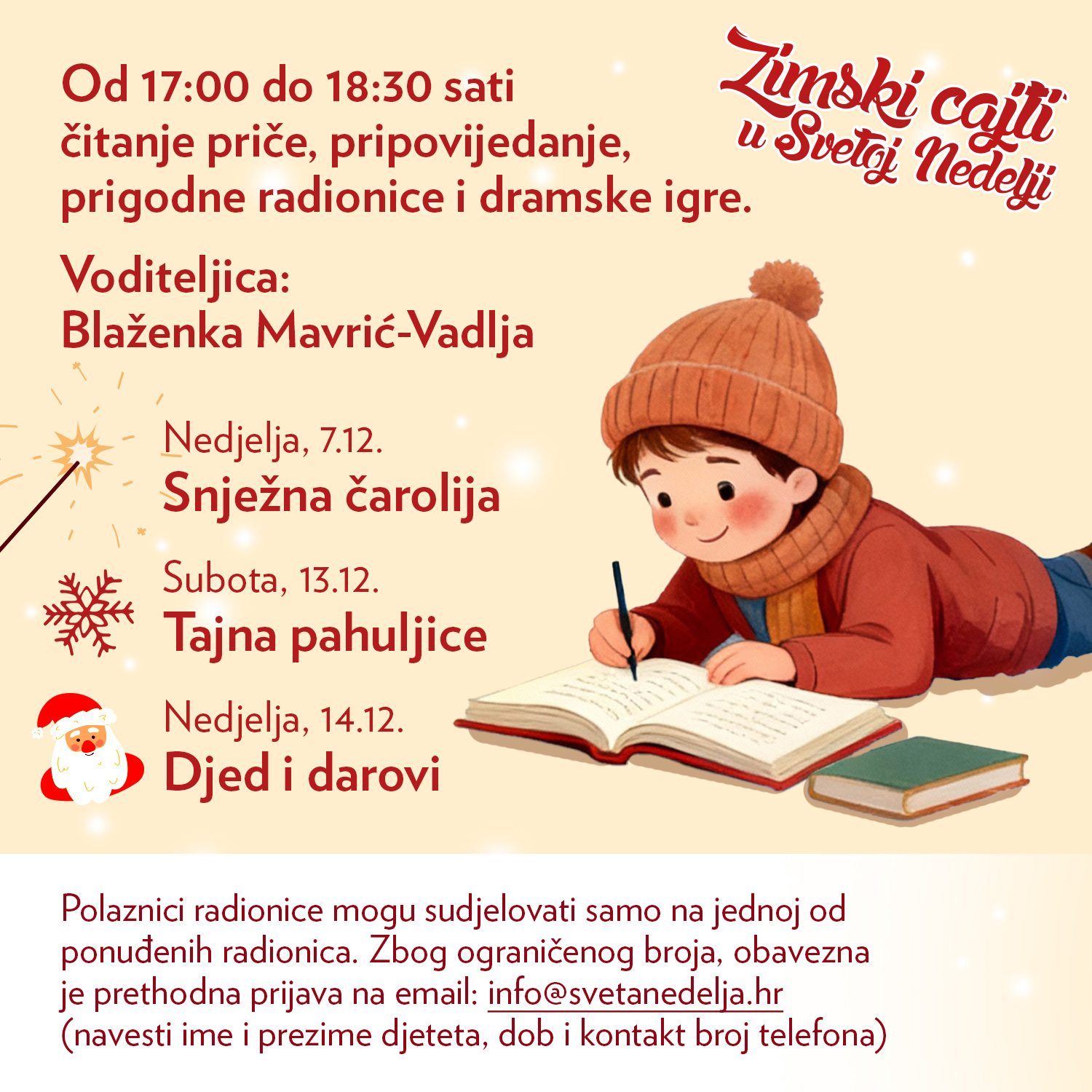 Dragi mališani i ove godine pripremili smo za vas vesele Božićne maštaonice. Radionice će se održati u Turističko-informativnom centru Svete Nedelje 7., 13. i 14. prosinca 2025. godine od 17.00 do 18.30 sati.